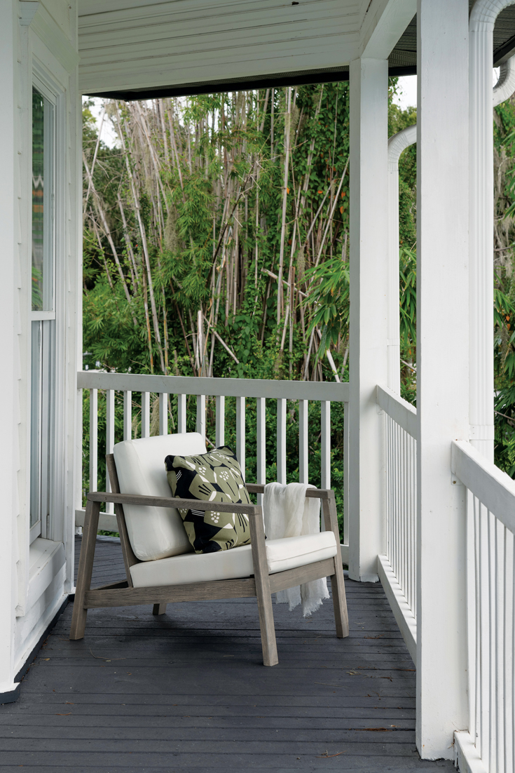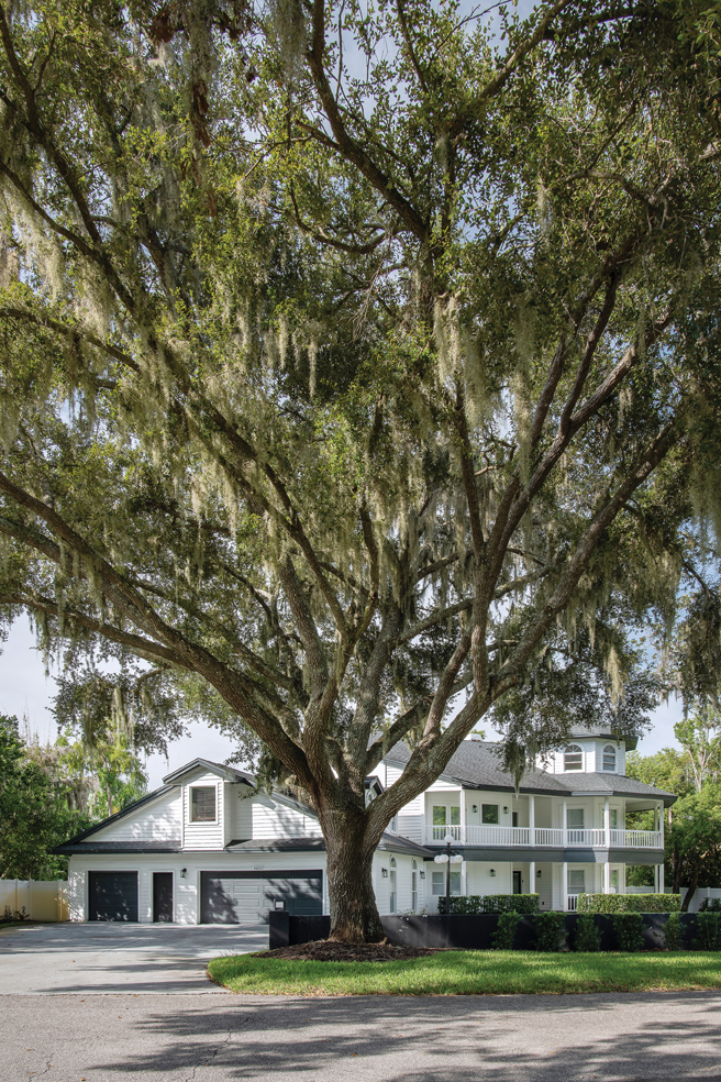 Al llegar a la casa, un viejo roble sureño domina la entrada. Por detrás, la fachada principal en blanco y negro armoniza con el verde circundante generando un clima de calma total.
