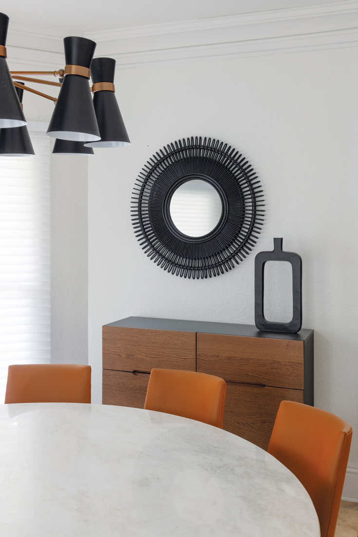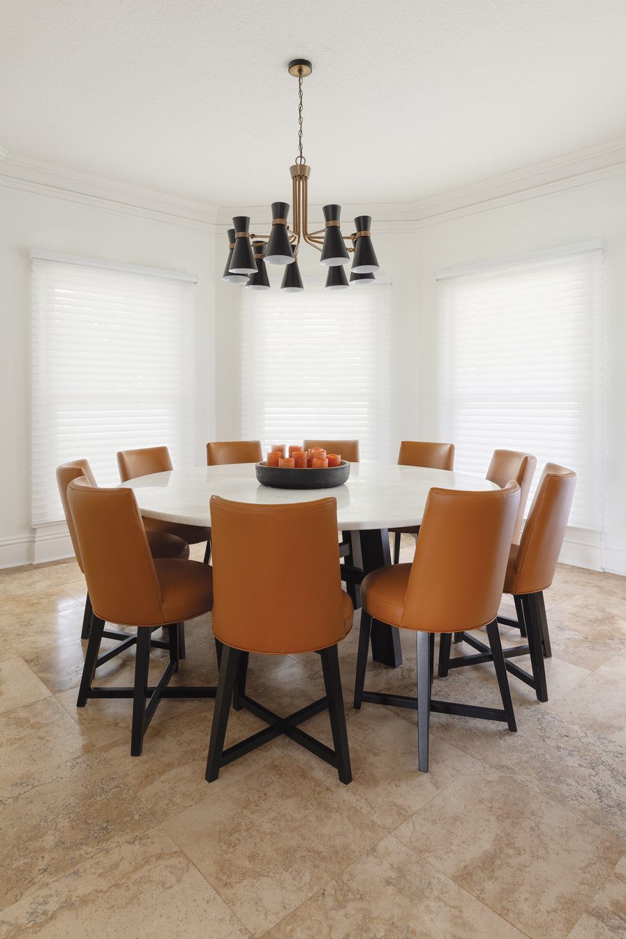 El comedor, de forma octogonal, con pisos originales de mármol de Boticcino, cortinas Silhouette de Hunter Douglas, lámpara colgante de los años cincuenta de un anticuario de New York, espejo de West Elm y vajillero Crate & Barrel. Sillas tapizadas en cuero color suela y mesa de mármol de Carrara (Estudio Muradas).
