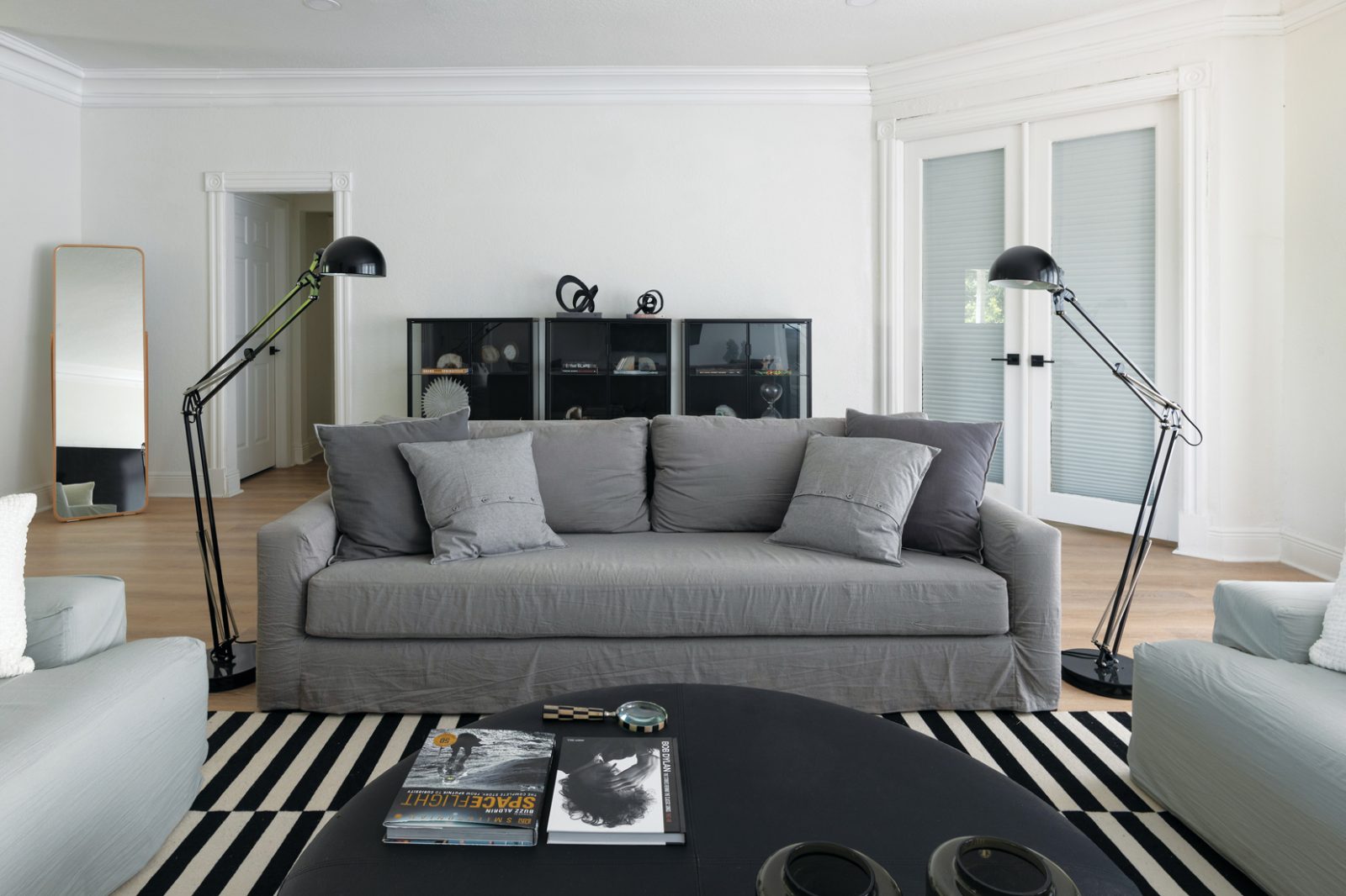 En el living, alfombra Beni Ouarain en lana de oveja. Sofá, sillones y mesa de centro de Estudio Muradas. Candelabros, mesas de cemento y mesas de metal de Crate & Barrel. Cortinas de gasa.