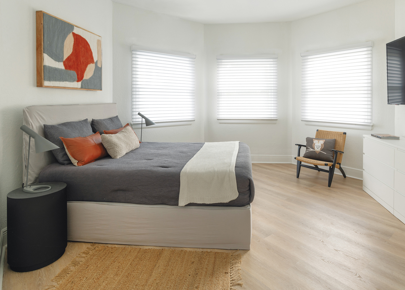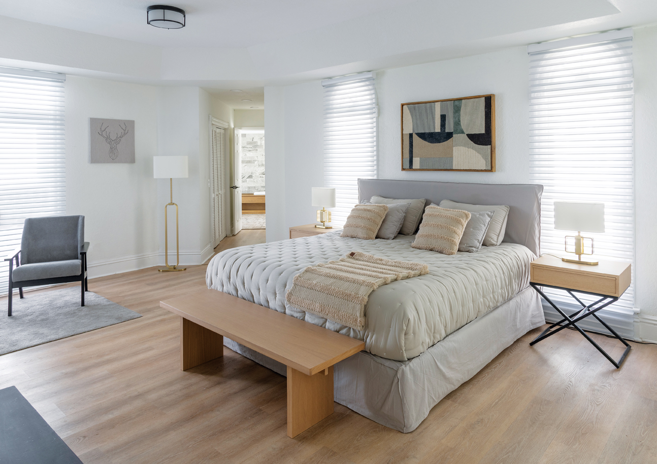Dormitorio principal con cama y mesas de luz de Estudio Muradas (los géneros son de Compañía del Comercio). Ropa de cama (West Elm) y lámparas (Sit Down New York). Obra en telar de un artista local y cortinas Silhouette (Hunter Douglas).