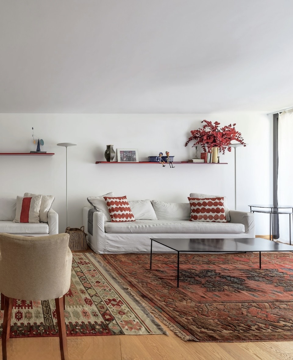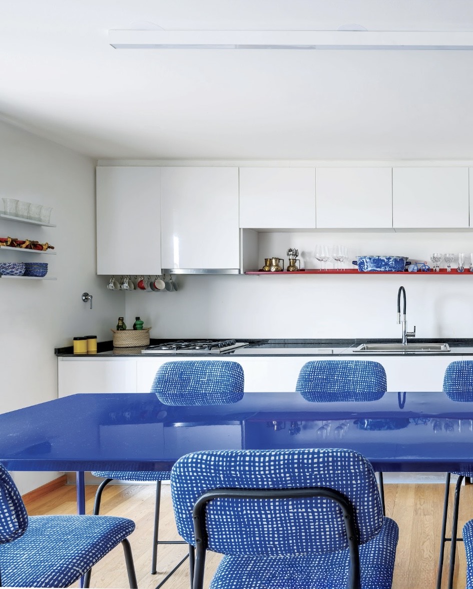 Súper ambiente principal con repisas de chapa color bordó, diseñadas y hechas a medida por Dolores Chara Díaz, interiorista del proyecto. Alfombra kilim de Mihran y almohadones de lino con círculos pintados a mano de Didot. Mesa tipo barra de 3 m de largo pintada de un azul vibrante, diseño de la interiorista. Banquetas altas tapizadas con un género de Luna Oks, impermeabilizadas para el uso diario en la cocina. (400)