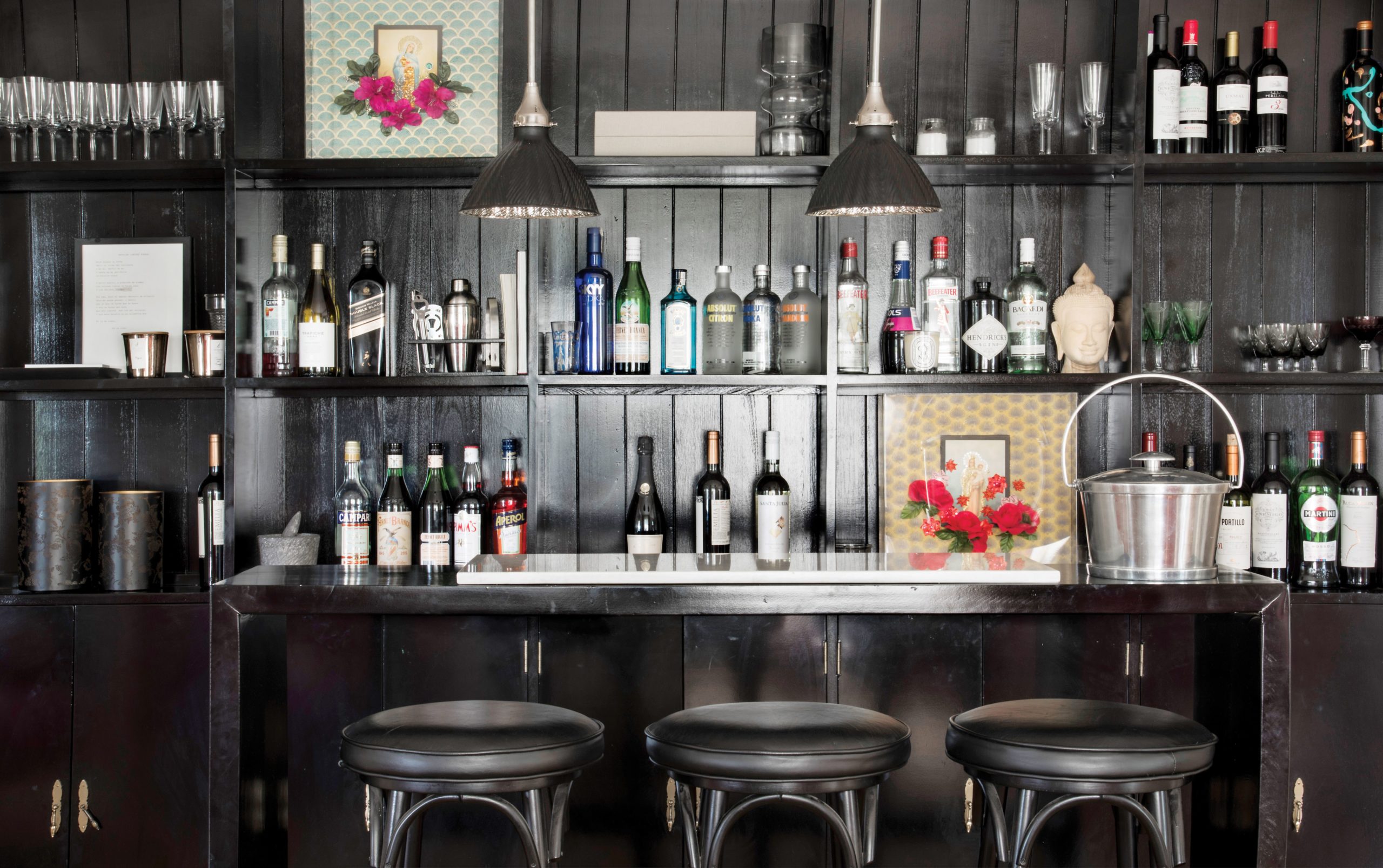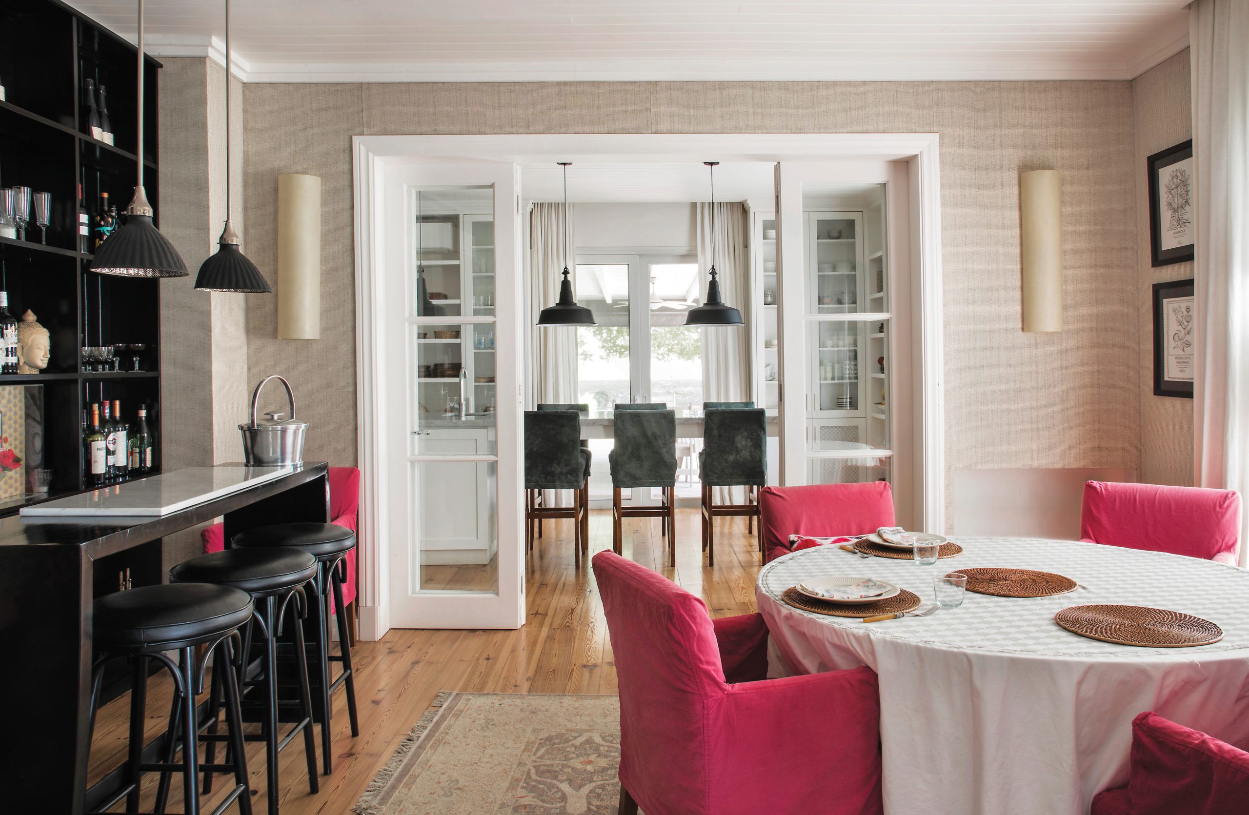 El hall de entrada funciona como un playroom no oficial: “Fútbol, patines, polito de a pie… todo vale” explica Lolo. La mesa de lapacho antiguo (Santo) y los espejos ovales (El Sótano Vintage) alternan con obras de Zelmira Peralta Ramos. Más allá, el comedor y un bar de madera con fondo íntegramente pintado de negro, con lámparas y banquetas (La Pasionaria).