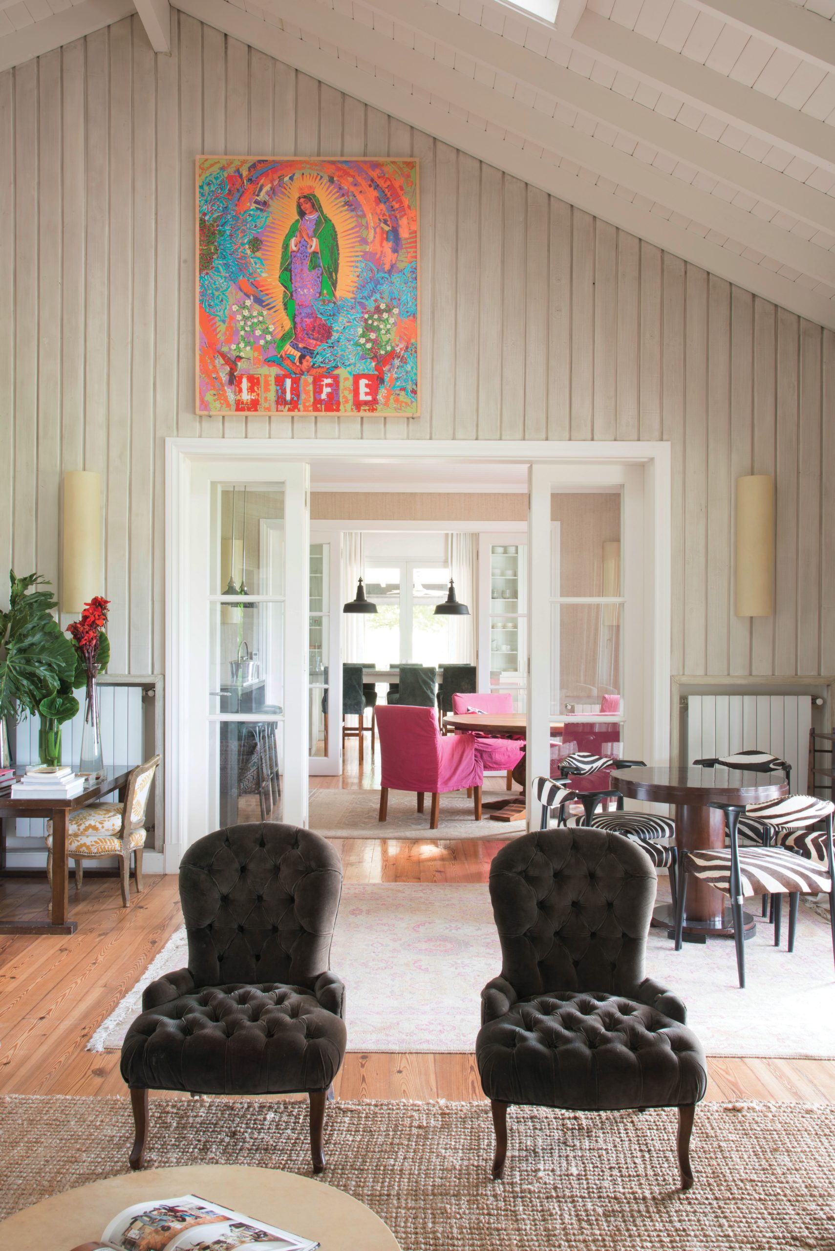 La doble altura fue revestida con madera pintada de blanco. Sobre una alfombra tejida, asientos negros, mesa redonda y sillas cebra (El Sótano Vintage). Las obras de arte son de González Oliva, Loly Acuña, Ricardo Crespo, Natalia Orlowski, Milo Lockett y Valdez (Galería Palatina).